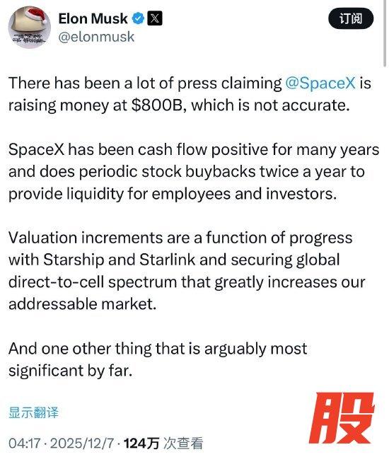 马斯克在其社交媒体平台 X的一篇帖子中表示:“SpaceX以8000亿美元估值融资的消息并不准确。SpaceX 多年来一直保持现金流为正,且每年会定期进行两次股票回购,为员工和投资者提供流动性。估值的提升取决于星舰(Starship)和星链(Starlink)的推进进展,以及获得全球直连手机网络的频谱,这将大幅扩大公司可服务市场的规模。”