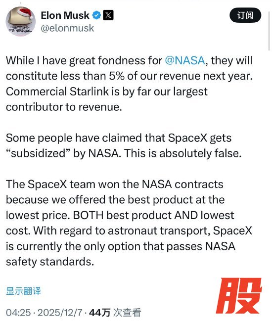 他接着回复道:“我个人非常敬重NASA,但明年他们在我们总收入中的占比不会超过5%。商业化的Starlink仍然是我们收入贡献最大的一块。外界有些说法认为SpaceX是靠NASA‘补贴’起来的,这种说法是完全错误的。SpaceX能拿下NASA的合同,是因为我们既能提供性能最好的产品,又能做到最低的成本——两者同时做到。在宇航员运输业务上,SpaceX目前是唯一通过NASA安全标准的方案。”